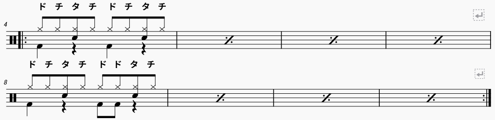 最初はどこにバスドラムが入るのか分からなくなることが多いですが、「ドチタチ」と「チドタチ」を分けて練習すると、整理しやすくなります!
