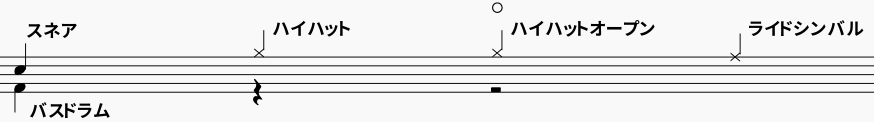 各パーツの名称とドラムの楽譜の読み方は、このようになっています。
